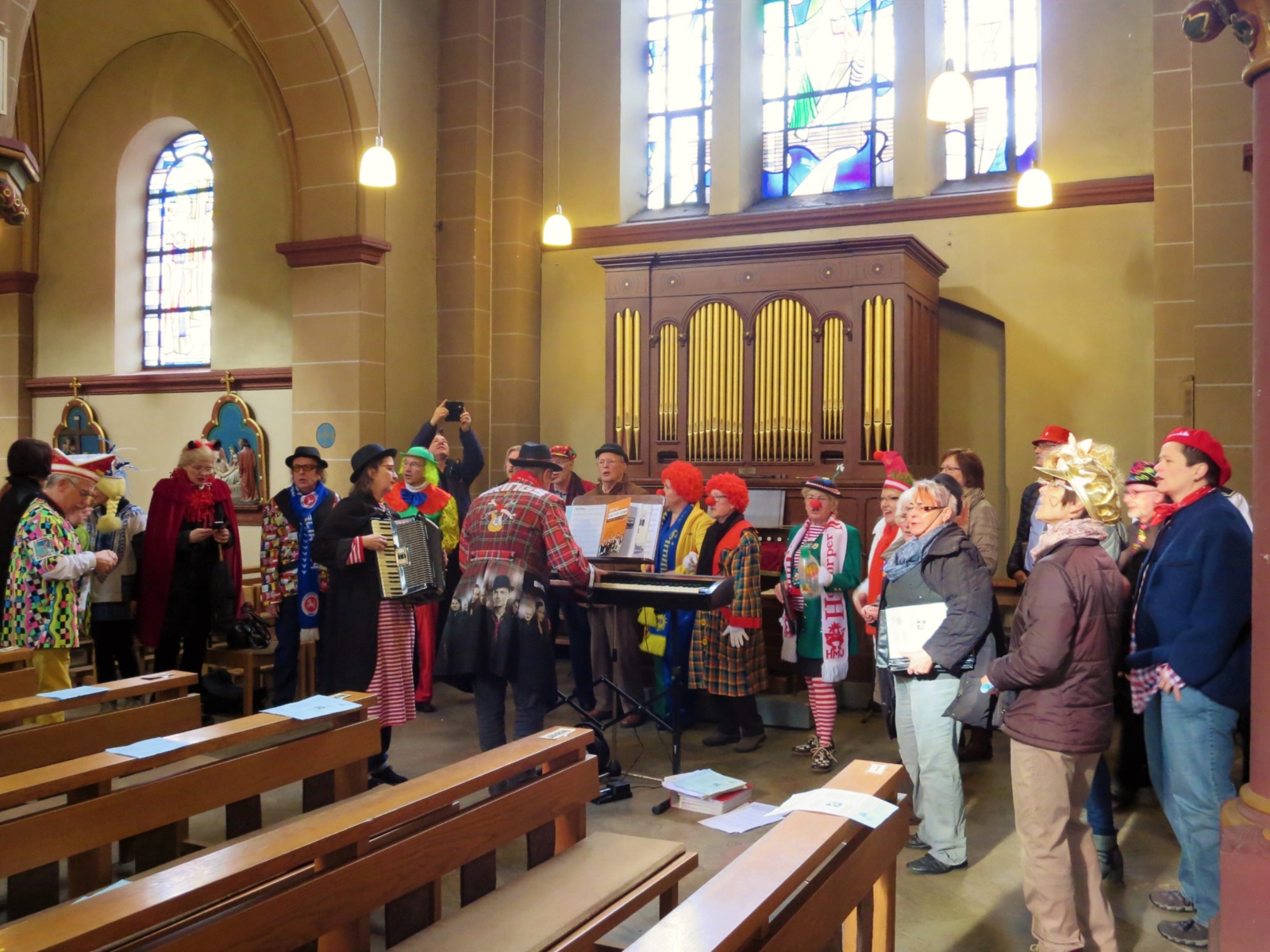 Stimmungsvoll wurde es immer dann, wenn Kapellmeister Bernhard zusammen mit den Sängerinnen und Sängern von Kirchenchor und Chor Unisono kölsches Liedgut anstimmte. Annette mit ihrem Quetschebüggel und zahlreiche Rasseln in den Bänken unterstützten den vielstimmigen Gesang. Und natürlich wurde ausgiebig geschunkelt.