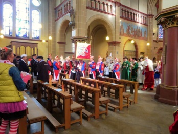 Ganz schön eng und bunt war es am Karnevalssonnstag im "Hetdörper Dom". Und das nicht nur im Altarraum, der von Prinz Ricky I, Jungfrau Manfrieda und Bauer Ralfi, zahlreichen Messdienern, Pfarrer Pitter, Diakon Christian, Gemeindereferent Tünn und Pastoralreferentin Judith gut gefüllt war, sondern auch in den Bänken.